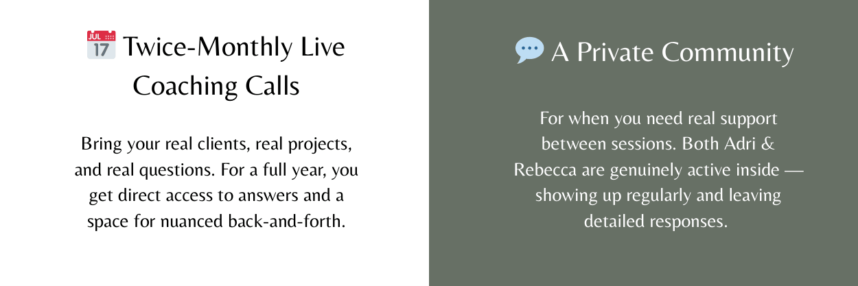 ✅ Live Q&A calls every other week for a full year — bring your real questions, your specific clients, your actual challenges!