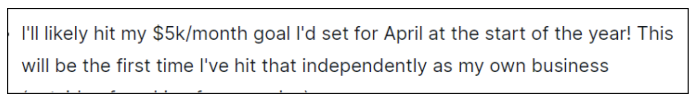 “I’ll likely hit my $5k/month goal I’d set for April at the start of the year instead! This will be the first time I’ve hit that independently as my own business.